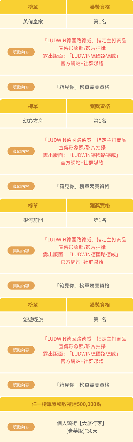 「好箱和你去旅行」活動限定禮物「悠遊輕旅」、「箱見你」、「大旅行家」、「旅行好咖」可累積「旅行故事」,爭取為「LUDWIN 德國路德威」主打商品宣傳推廣的機會 !