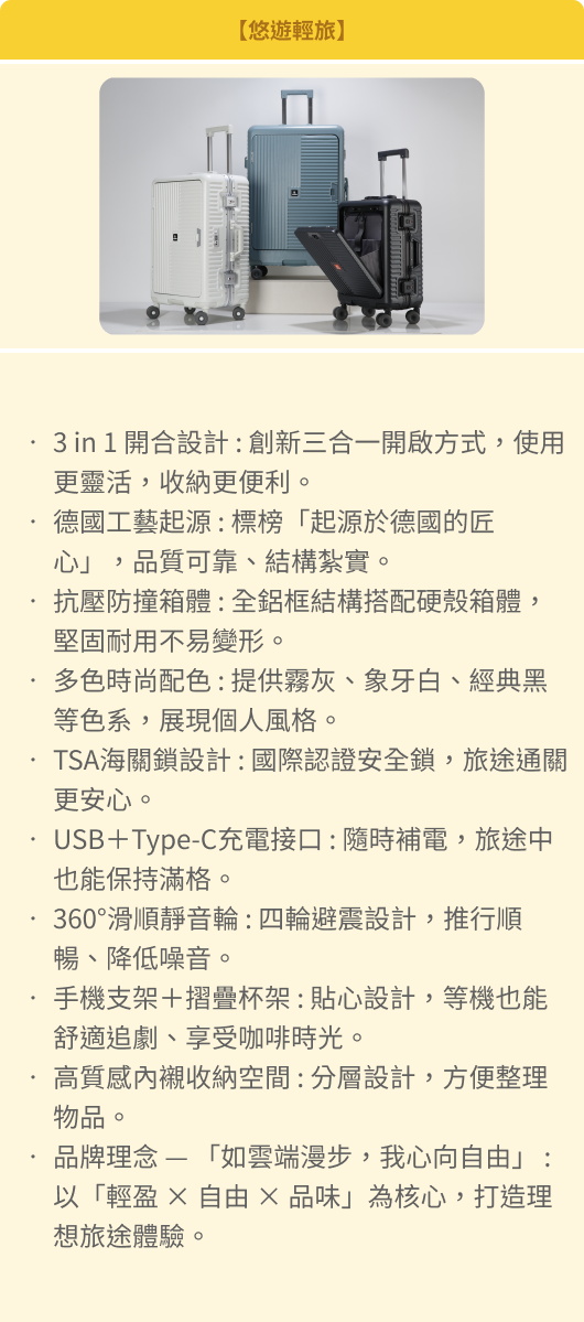 品牌主打 ABS+PC耐磨輕量材質,搭配 雙齒防爆防盜拉鍊 與 TSA國際海關密碼鎖,提供全方位的安全防護;靜音避震煞車輪設計,讓行進更穩更靜;而內建的 USB充電功能,更貼合數位世代旅人的需求。從城市出差到異國探險,Ludwin 在每一趟旅程中都展現出穩定與風格並存的魅力。