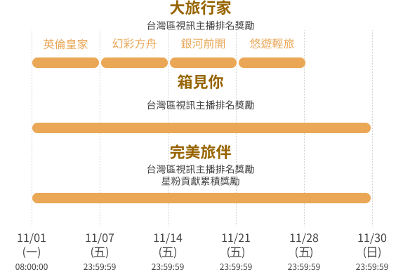 台灣區視訊主播及星粉們,在指定活動時間中累積收/送「好箱和你去旅行」活動限定禮物,達指定收/送禮點數門檻便可獲得相對應的活動限定特效獎勵!