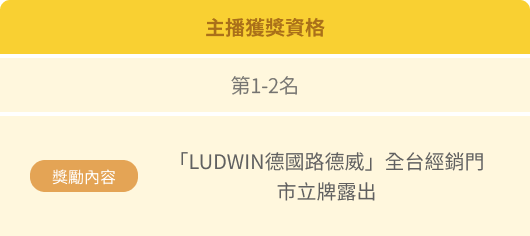 8.「大旅行家」榜單中與「LUDWIN德國路德威」指定主打商品宣傳資格得獎項目相關獎勵將不得重覆,主播若有重覆得獎之情況,官方將依本活動月總榜中,收禮總點數高者為依序安排遞補者。