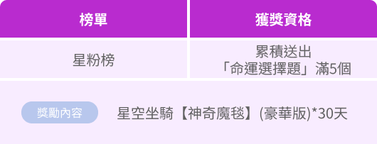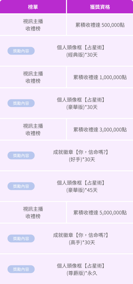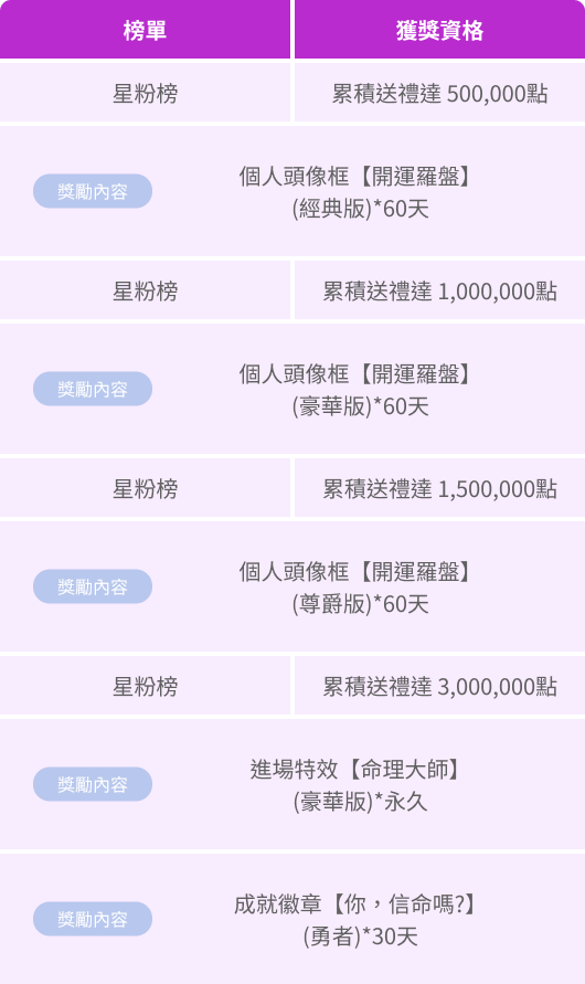 註 : 主播/星粉榜中相同類型獎勵領取,以累積收禮達到之最高門檻為主,非累計領取。