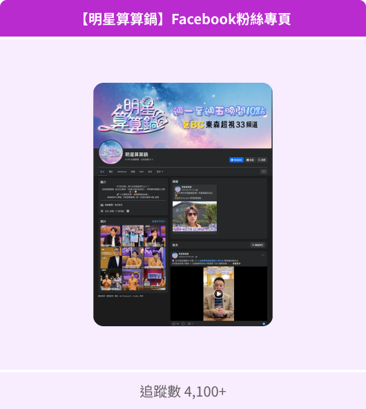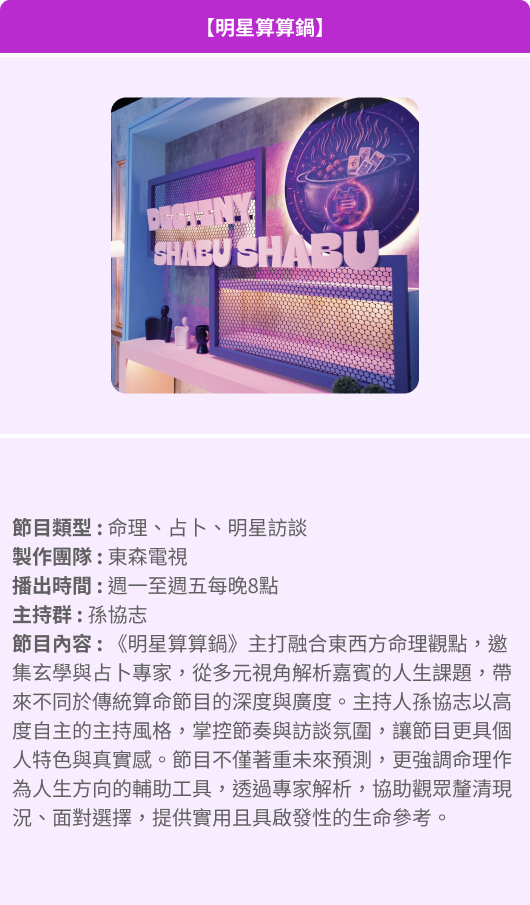 東森超視全新節目《明星算算鍋》正式開鍋 ! 節目融合命理解析、運勢占卜與輕鬆談話,邀請藝人分享人生故事,在歡笑中算好運、翻轉命運。