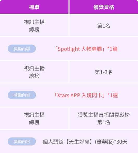 註 : 各榜單所有得獎資格將不得重覆,若主播重覆獲獎,遞補資格則由本活動月總榜中,收禮點數及獲獎名次高低依序安排。