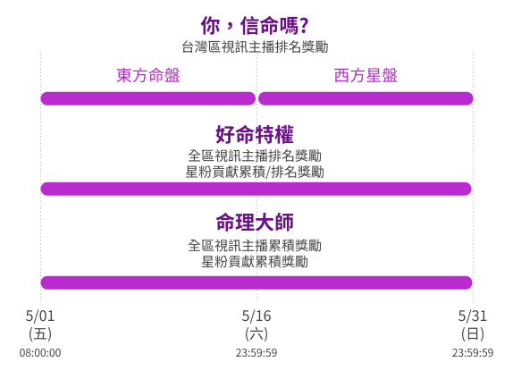 台灣區視訊主播們蒐集「你,信命嗎?」活動禮物累積生命靈數,奪下任一榜單第1名主播即可與藝人們同台算好運,過好命 !