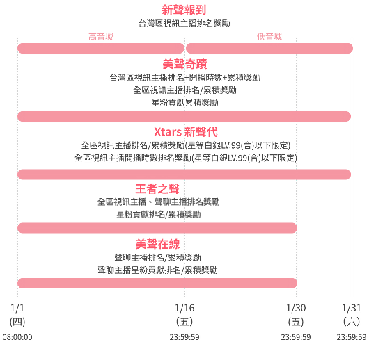 【新星主播熱力榜】1月星等白銀LV.99(含)以下全區新星視訊主播們,把新年的祝福化成最動人的美聲吧 ! 讓你在直播間每一次開播,都是為新的一年定下節奏 ; 每一段歌聲,都是屬於你的新聲宣言。用美聲魅力持續累積星粉們的共鳴,站上 「Xtars 新聲代」的起跑線。只要登上排行指定名次,即可贏得新星限定推薦版位,讓你的新聲宣言被更多人聽見 !