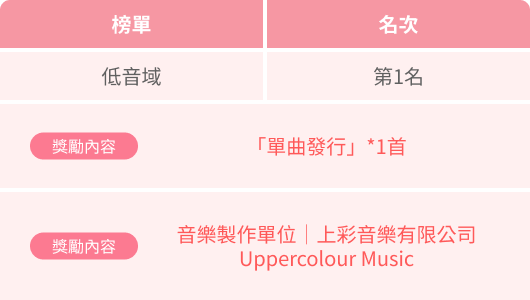 註二 : 「高音域」及「低音域」榜單獲獎主播將為共同發行,合唱單曲*1首。