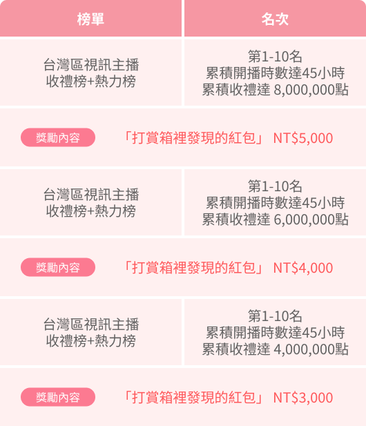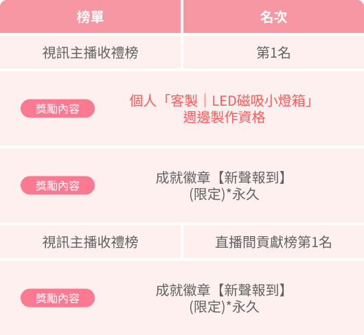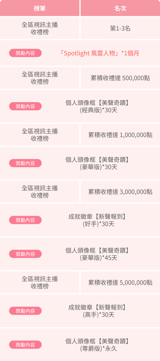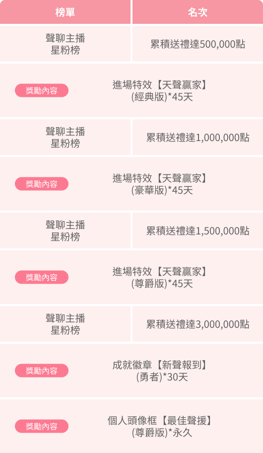 註 : 聲聊主播總榜中相同類型獎勵領取,以累積送禮達到之最高門檻為主,非累計領取